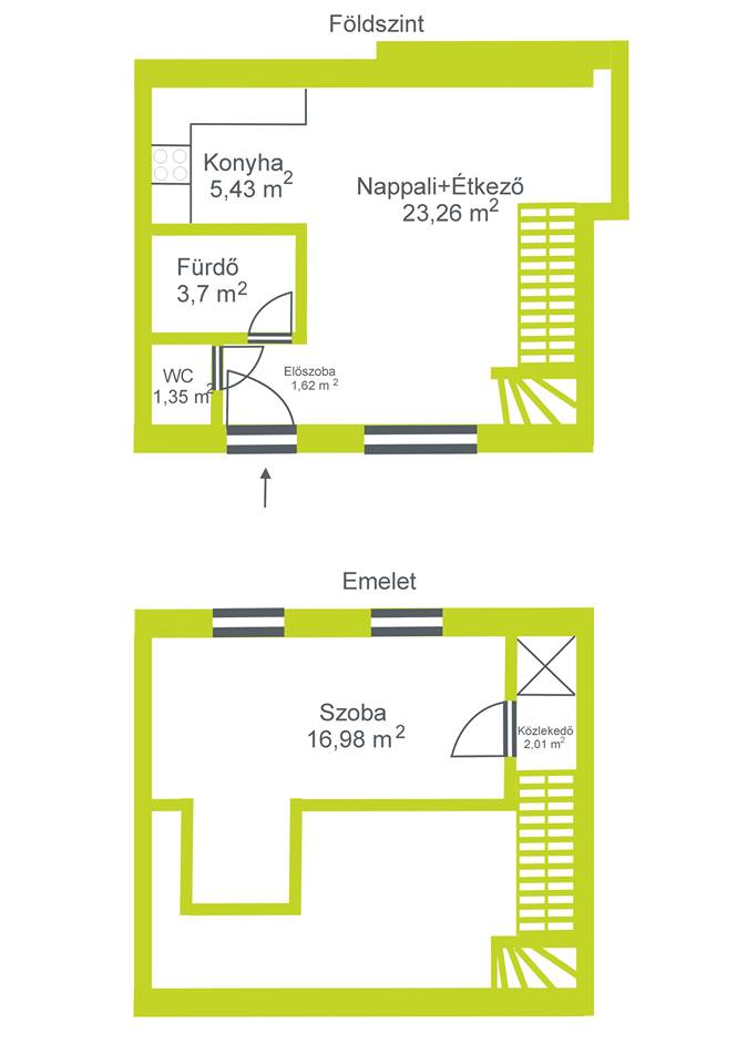 előtér, nappali étkezővel, 1 db hálószoba az emeleten, kádas fürdőszoba, külön WC, konyha.