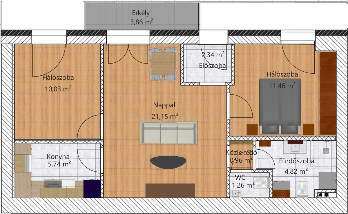 előtér, nappali étkezővel, 2 db hálószoba, kádas fürdőszoba WC-vel, külön WC, konyha.