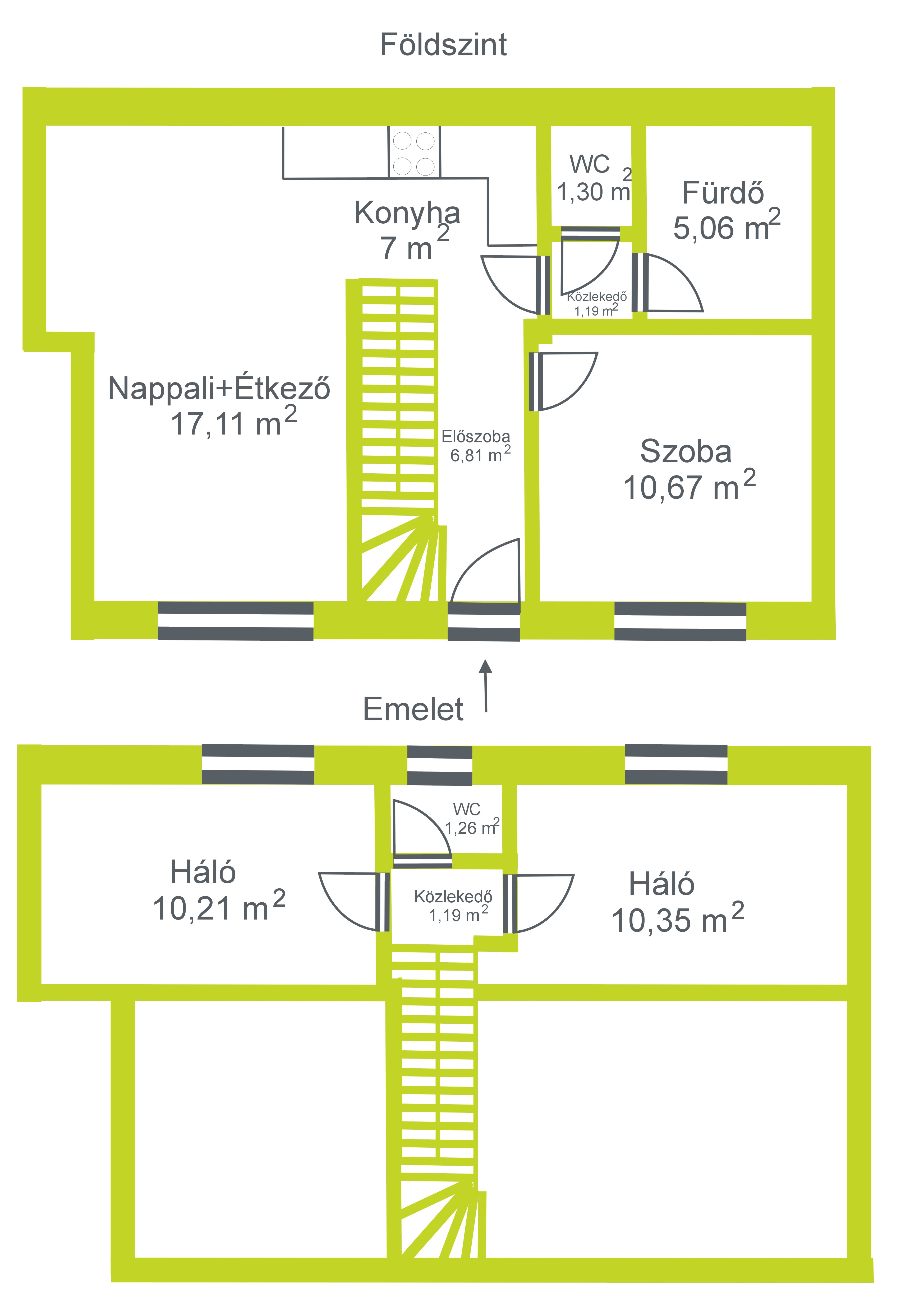 előtér, amerikai konyhás nappali, 1 db hálószoba a földszinten, 2 db hálószoba az emeleten, kádas fürdőszoba, 2 db külön WC.