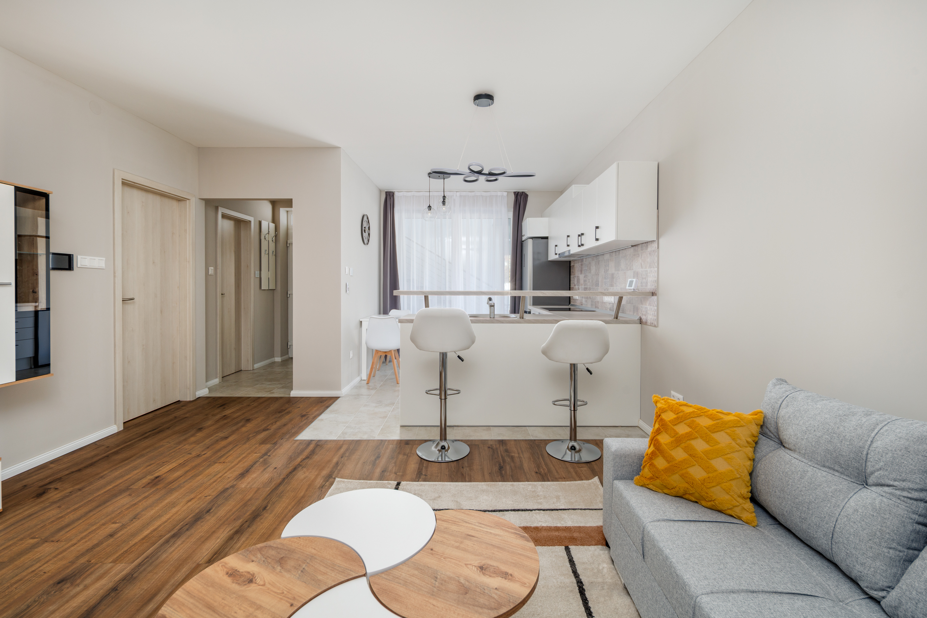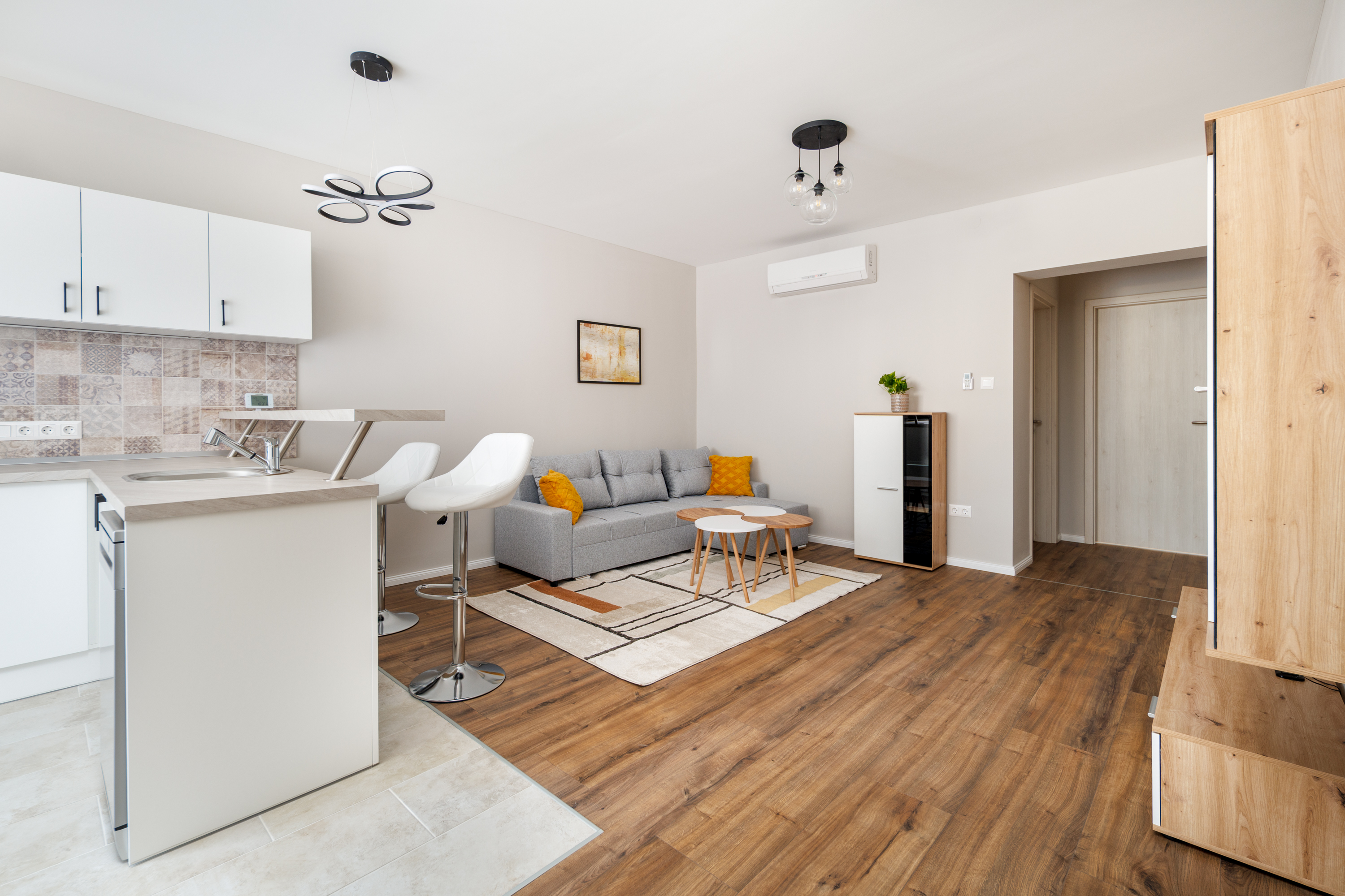 A lakás teljesen berendezett, gépesített (hűtőszekrény, mosógép szárítógéppel, mosogatógép, beépített kerámia főzőlap és sütő, páraelszívó, fan-coil, elektromos redőny).
