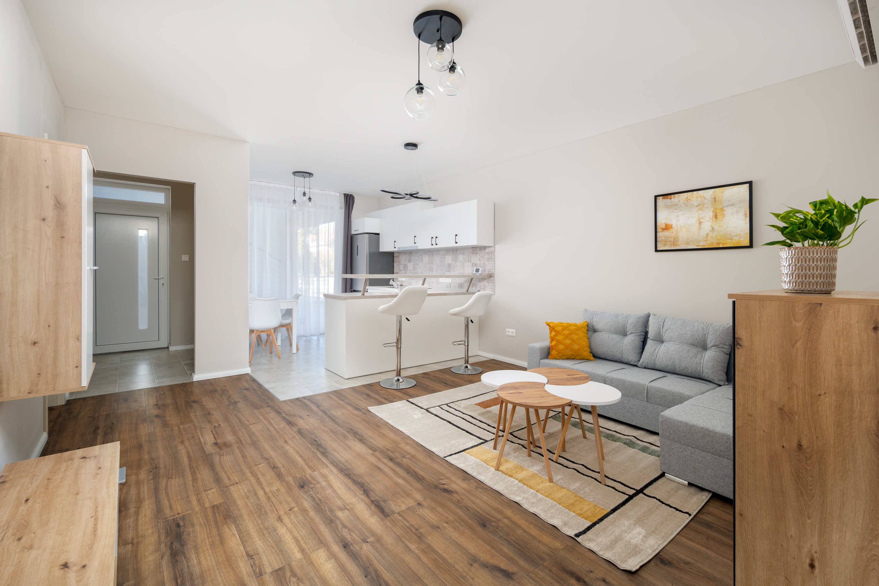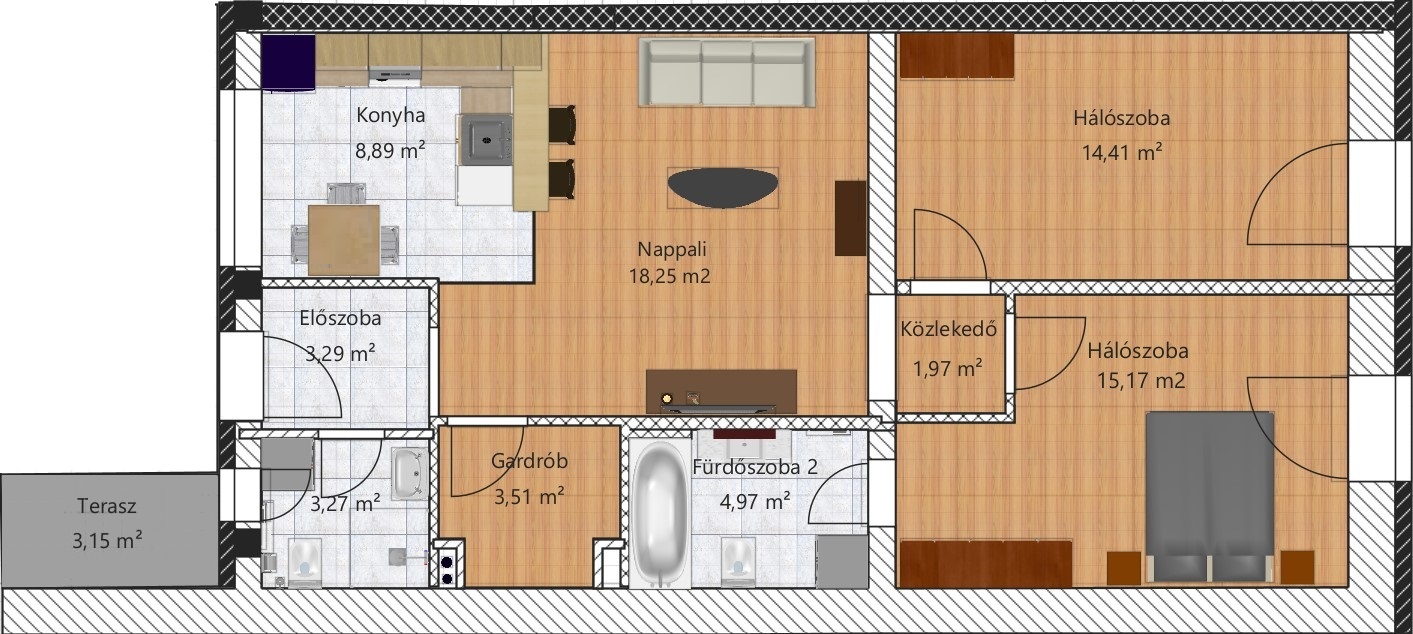 előtér, zuhanyzós fürdőszoba, amerikai konyhás nappali étkezővel, 2 db hálószoba, kádas fürdőszoba WC-vel.