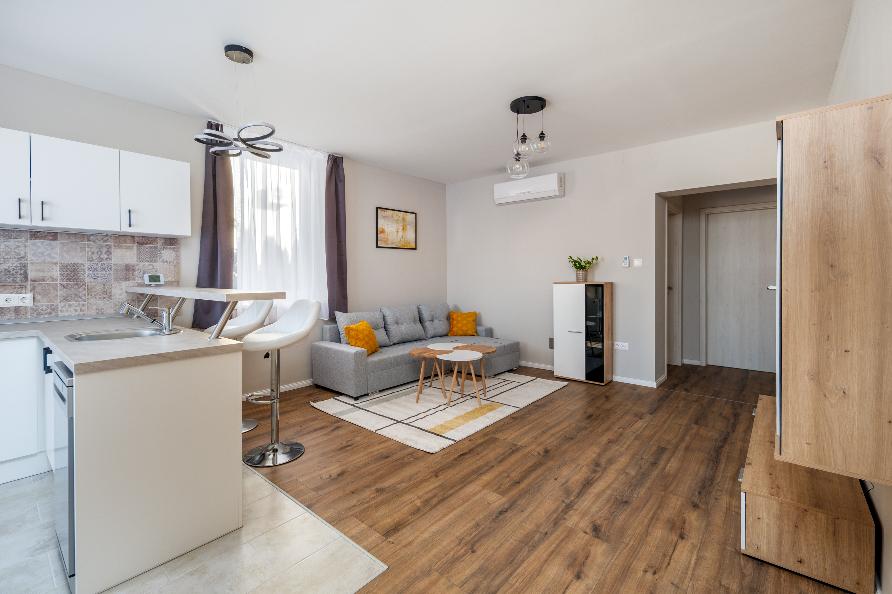 A lakás teljesen berendezett, gépesített (hűtőszekrény, mosógép szárítógéppel, mosogatógép, beépített kerámia főzőlap és sütő, páraelszívó, fan-coil, elektromos redőny). Burkolat: padlólap és laminált padló.