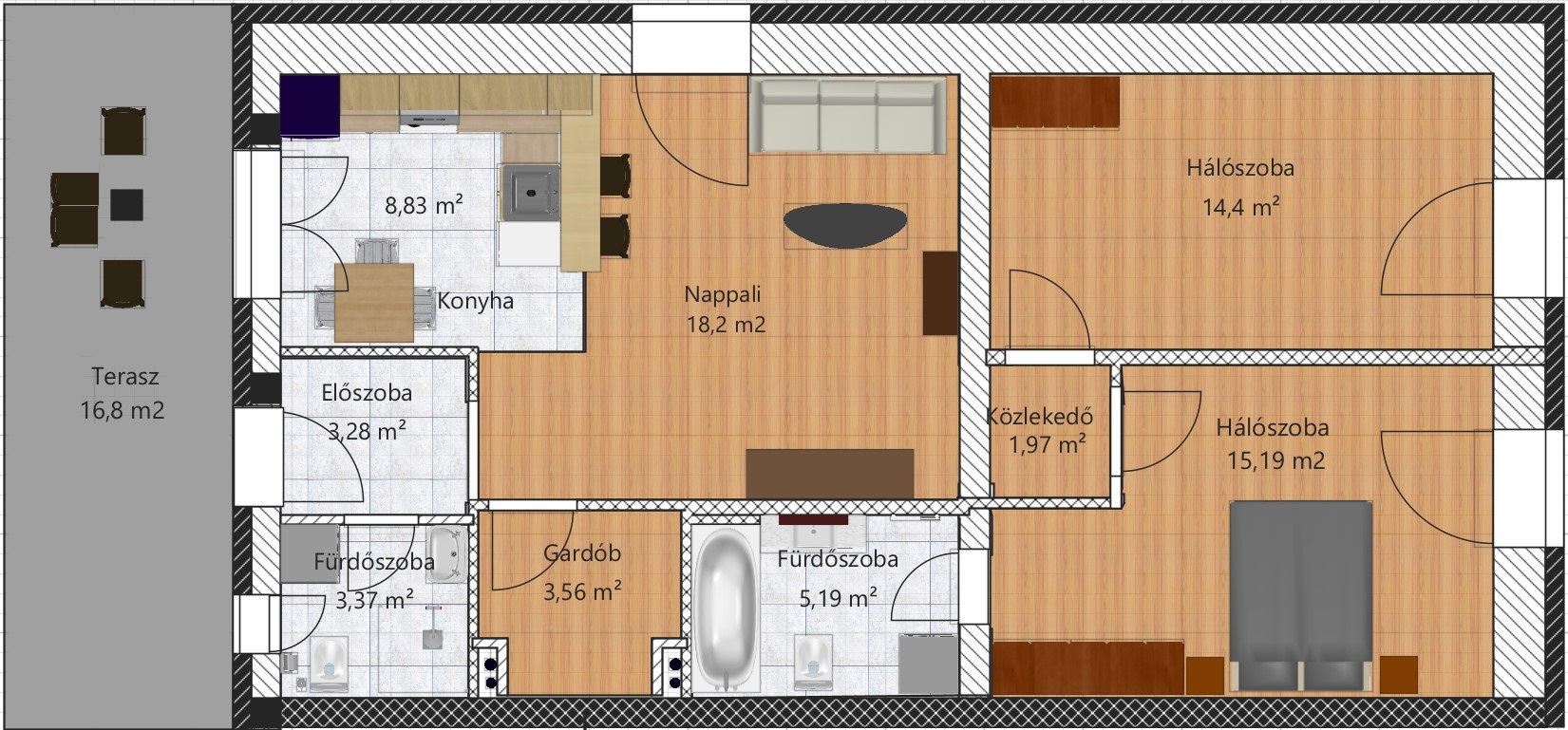 előtér, zuhanyzós fürdőszoba, amerikai konyhás nappali étkezővel, 2 db hálószoba, kádas fürdőszoba WC-vel.